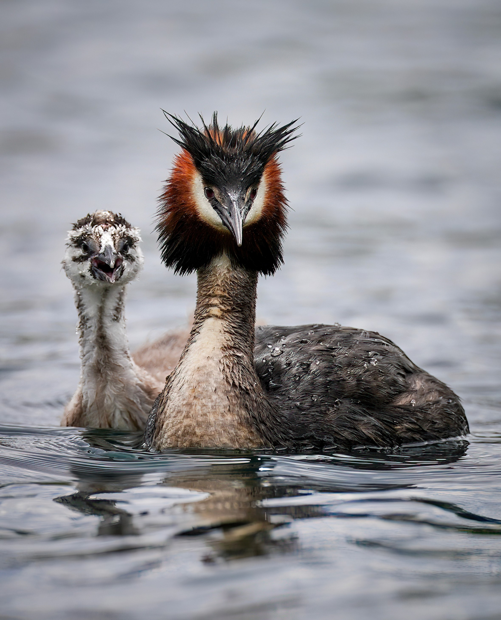 ‘Australasian crested grebe with chick'