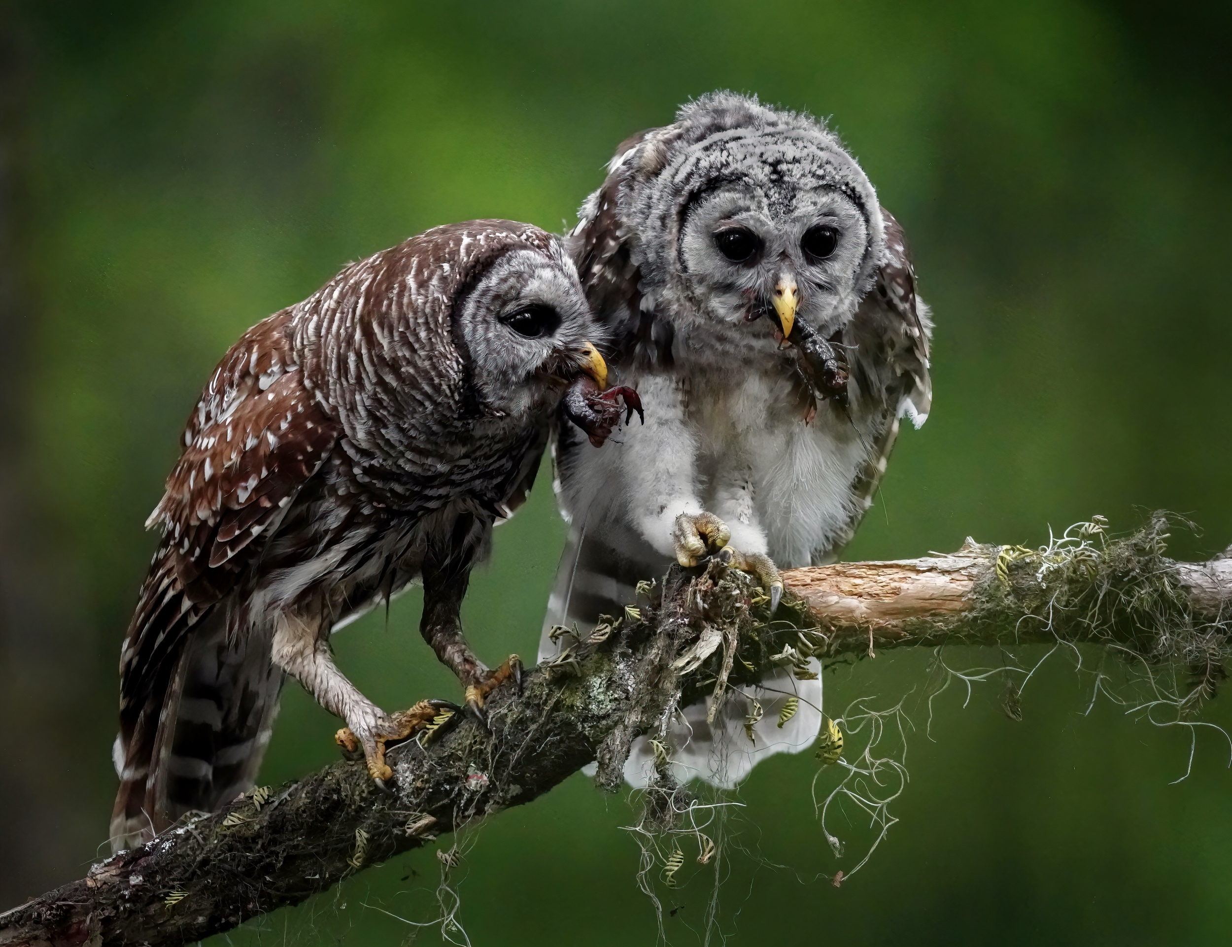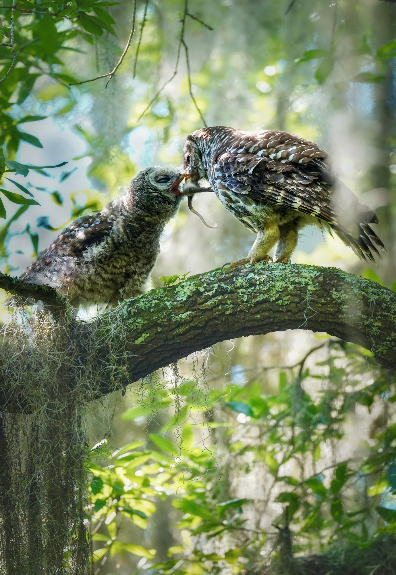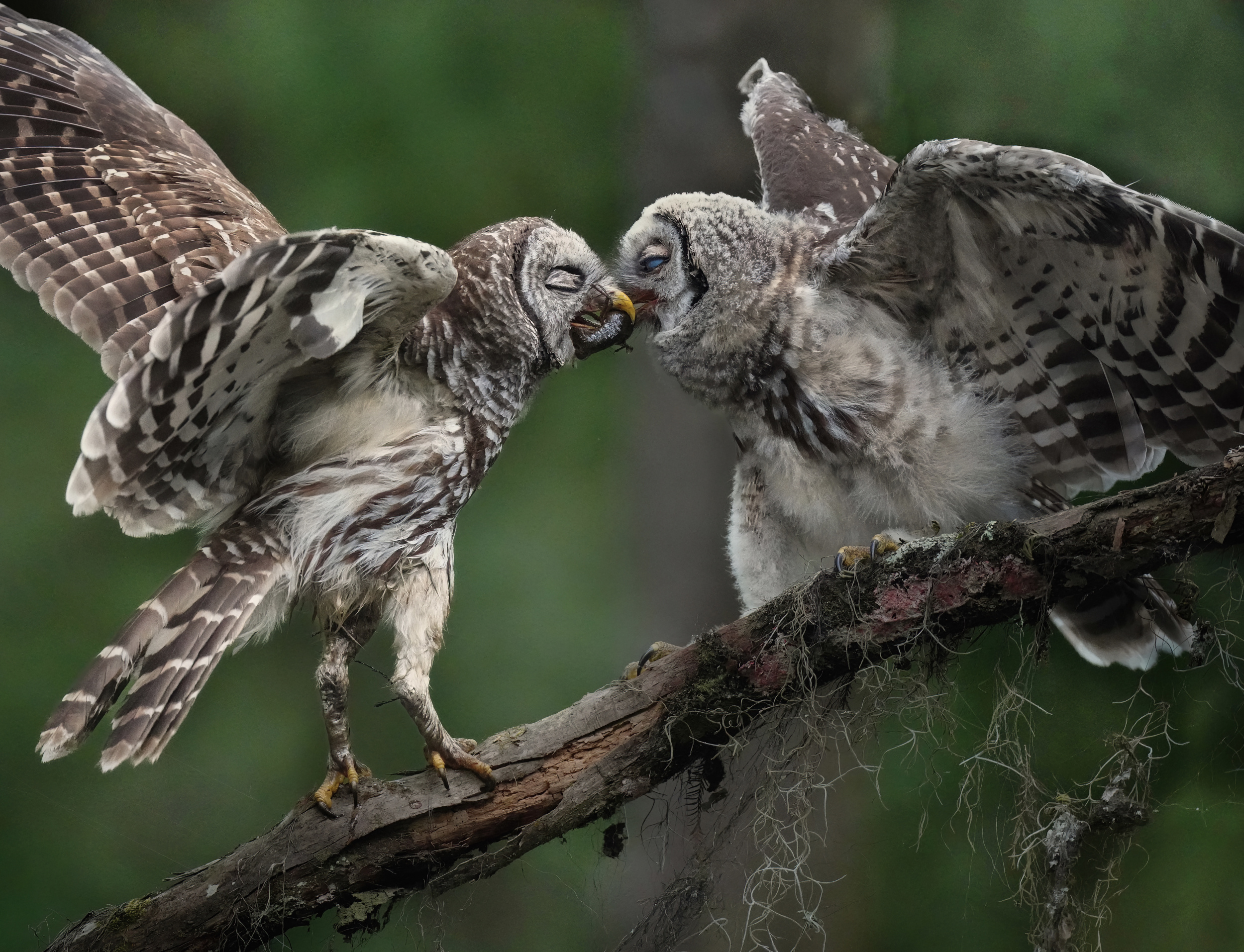 I have a few favourite images, but one that is more recent comes to mind. It shows a mother barred owl reaching out to her owlet with a crawfish. I was fortunate enough to witness the tenderness and care between them, which seemed almost cinematic.